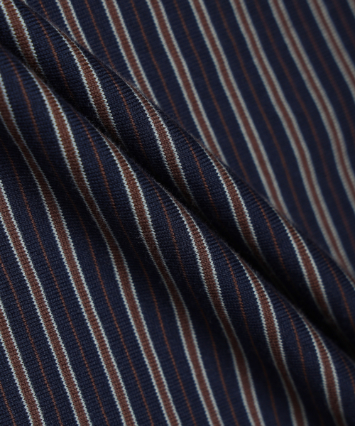 32수 2합 싱글 코튼 원단을 사용해 제작했습니다. 안정적인 조직 밀도를 바탕으로 편안한 착용감을 제공하며, 스트라이프 패턴은 자체적으로 개발하여 컬러 밸런스와 패턴 간격을 세심하게 조율했습니다. 일상에서 부담 없이 착용하실 수 있도록 자연스러운 텍스처와 안정적인 형태를 유지하도록 설계했습니다.