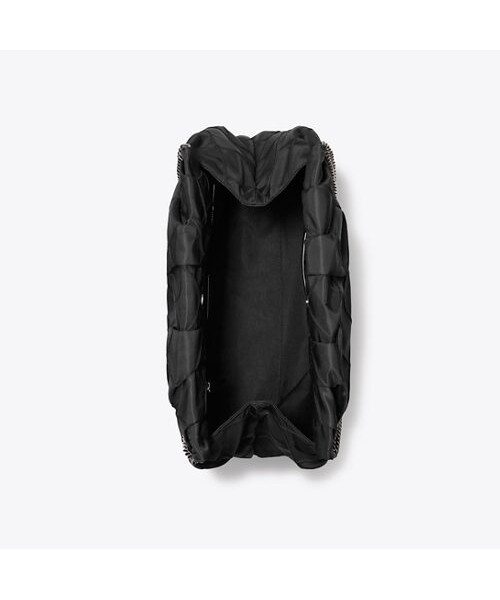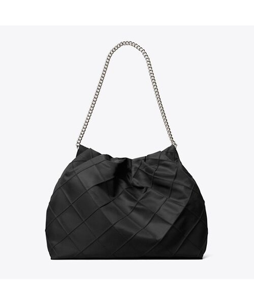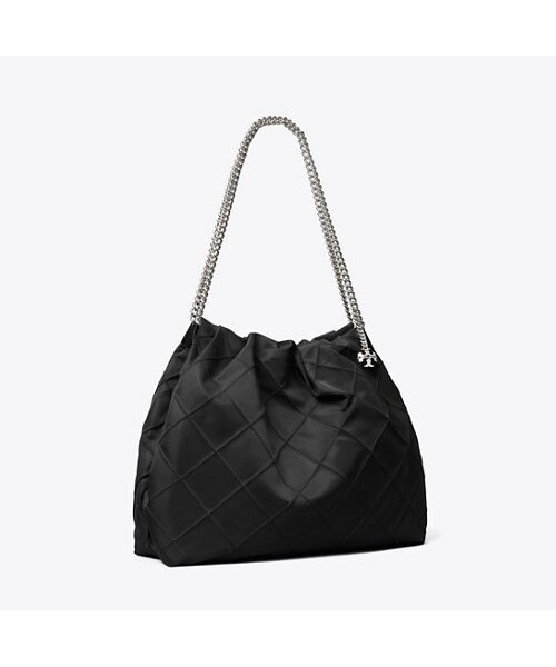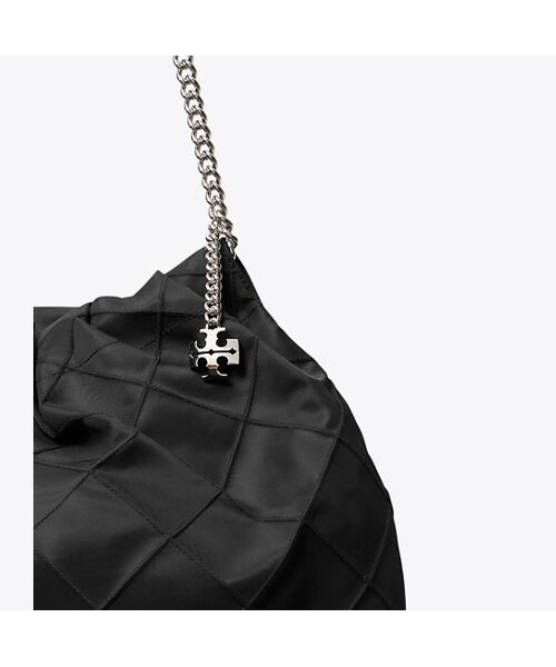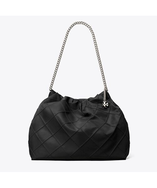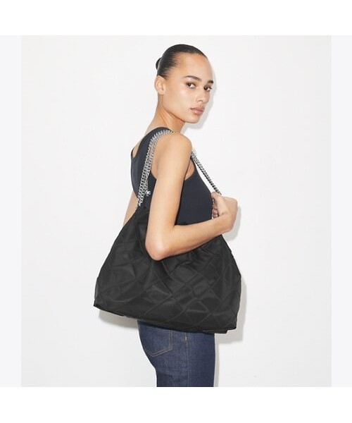 나일론 소재로 제작된 플레밍 나일론 호보입니다. 나일론 소재로 제작되어 가벼운 무게감이 특징이며 여유로운 수납력으로 데일리백은 물론 여행용 가방으로도 활용하기 좋은 아이템입니다. 플레밍 시리즈 만의 다이아몬드 핀턱 디테일과 체인 스트랩으로 페미닌한 무드를 더했으며, 체인 스트랩에 연결된 토리버치 로고 참으로 포인트를 더했습니다.
