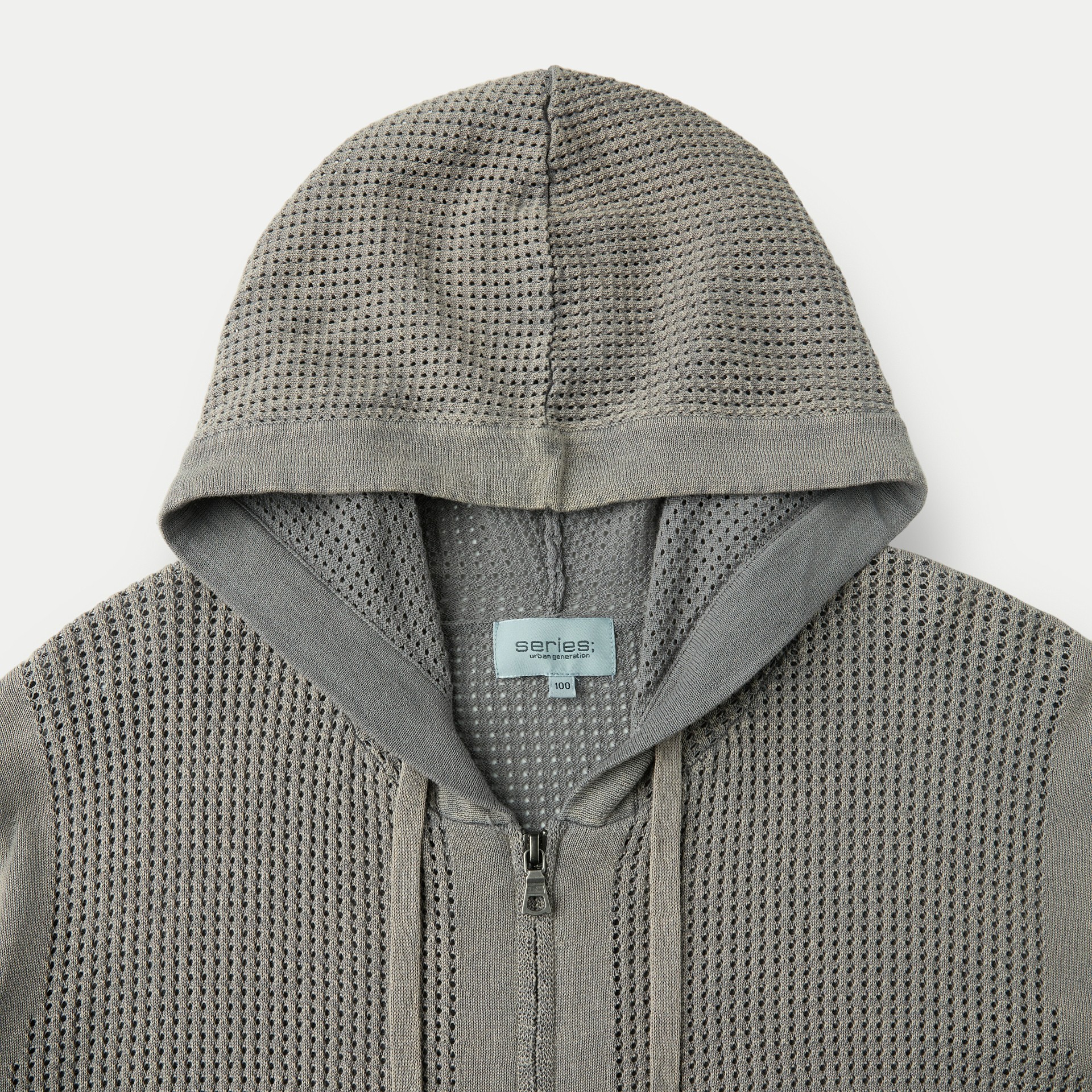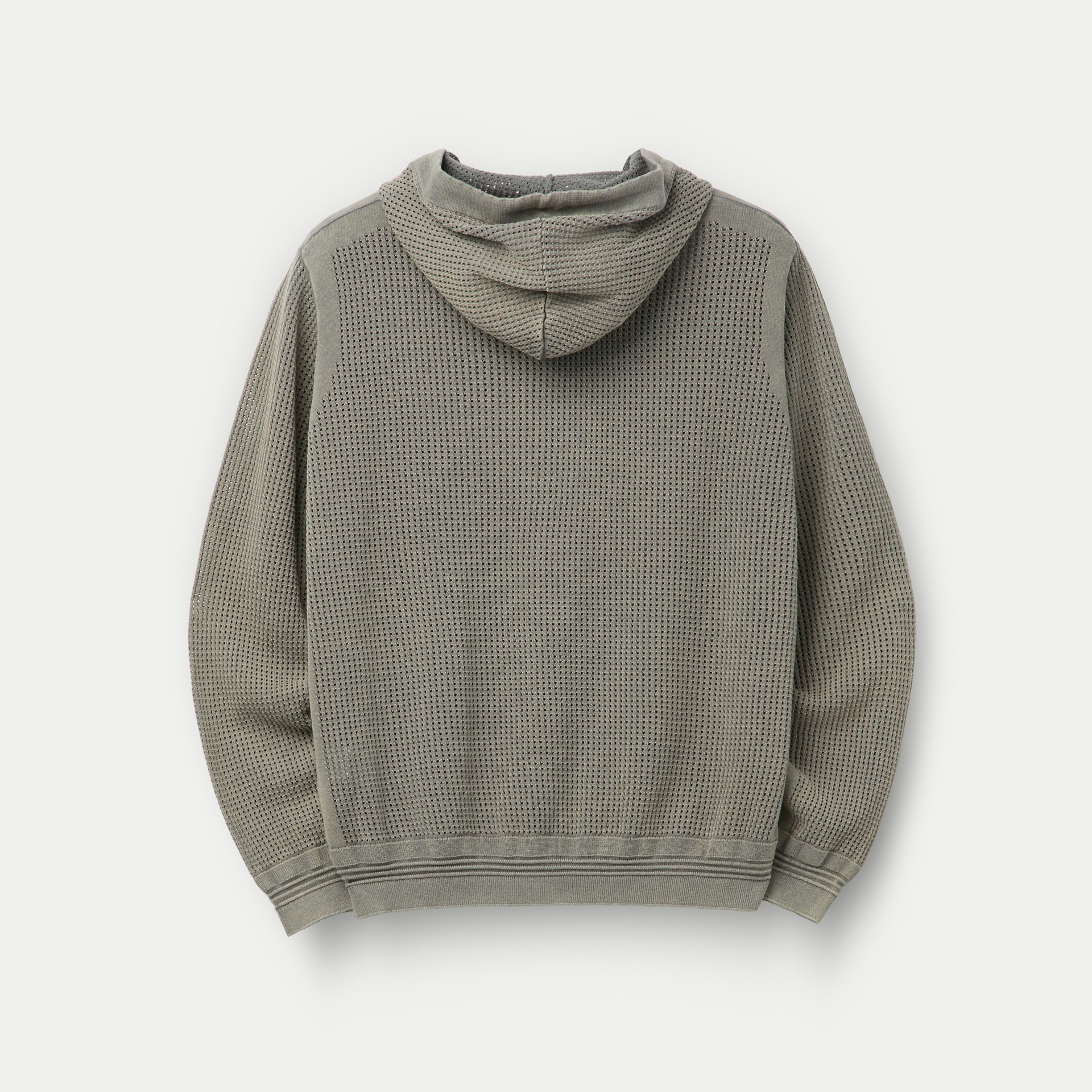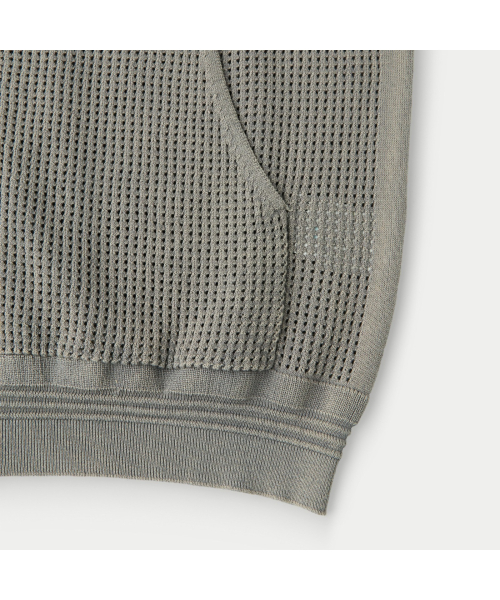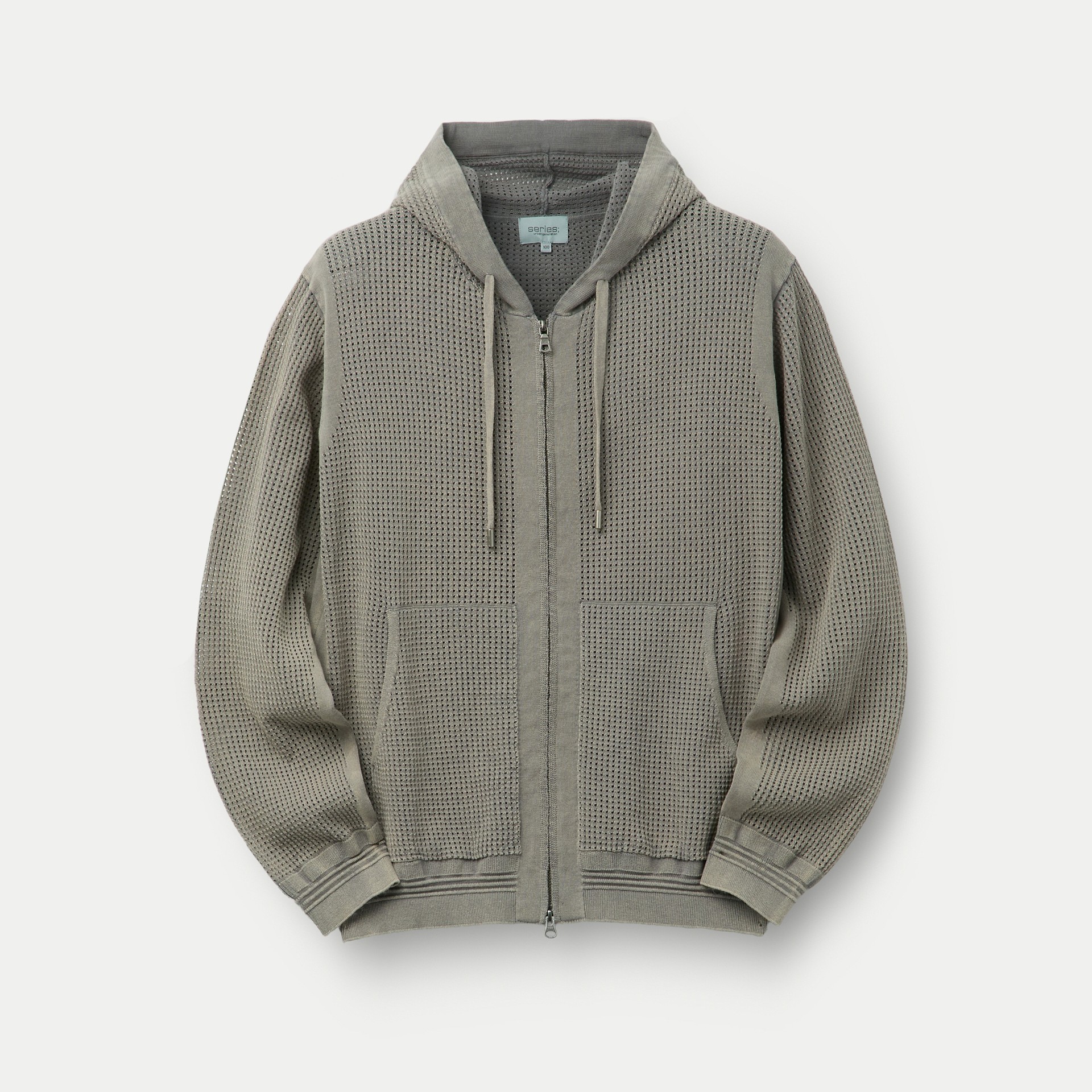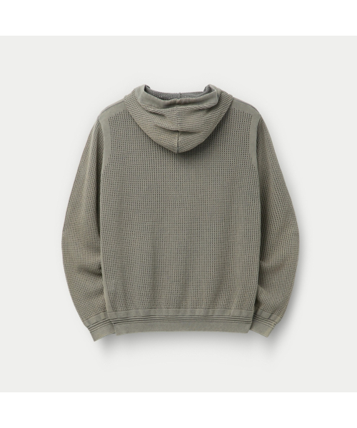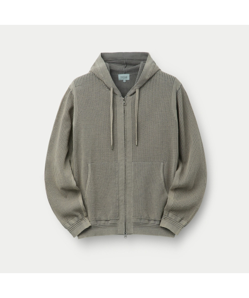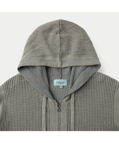 가먼트 다잉 기법으로 시리즈 감도를 담아 완성한 니트 후드 집업.