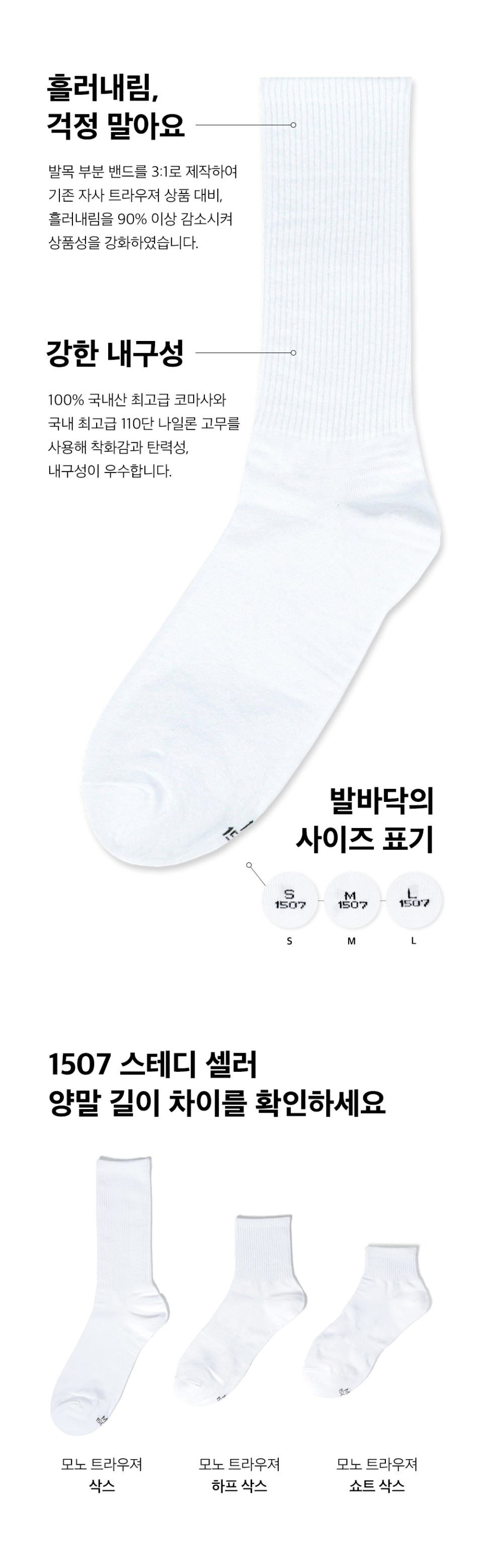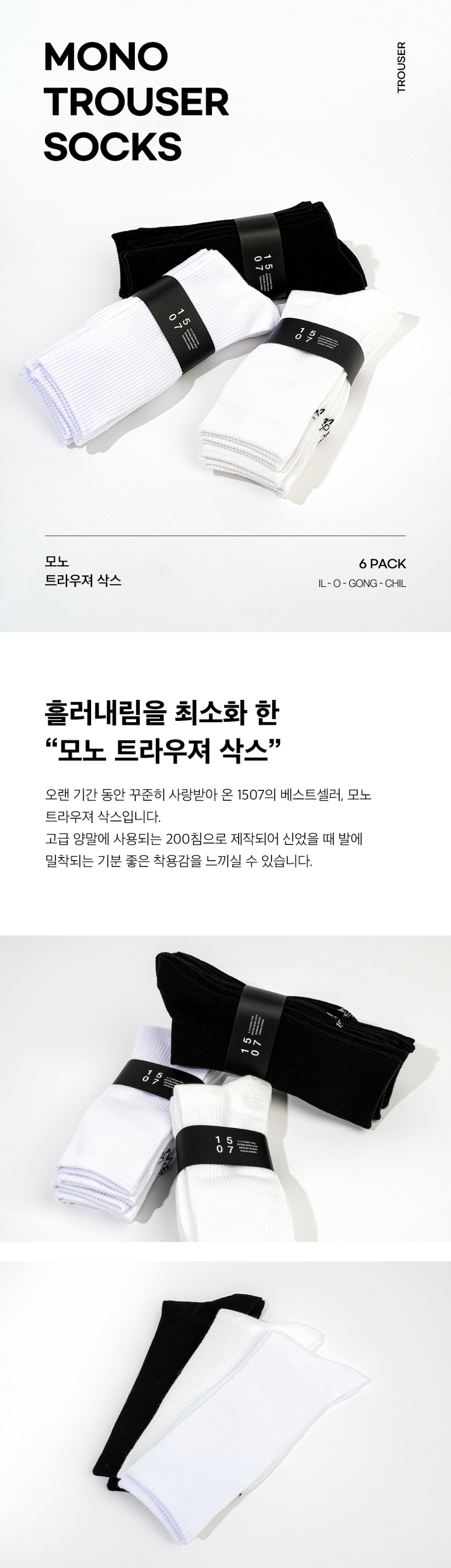 1507(일오공칠)은 그 시작인 창고 번지수 '1507'을 의미하며, 다양한 라이프스타일을 가진 사람들의 요구를 적극적으로 반영하고 그들의 더 나은 삶을 위해 노력하는 브랜드입니다. 2대에 걸친 양말 제작의 노하우로 높은 품질과 심플한 디자인의 양말을 제작하며, 우수한 품질과 합리적인 가격의 언더웨어를 제공합니다. 품질에만 집중하여 최소의 디자인으로 최대 퀄리티의 상품을 제작합니다.