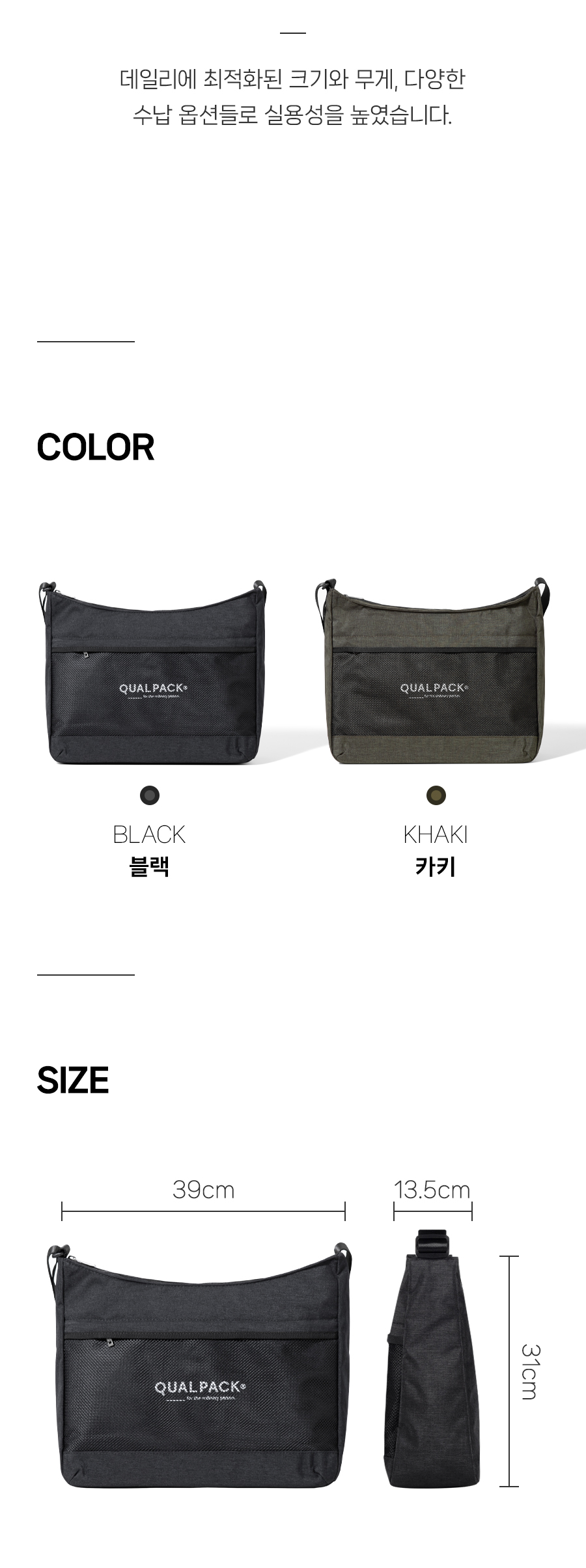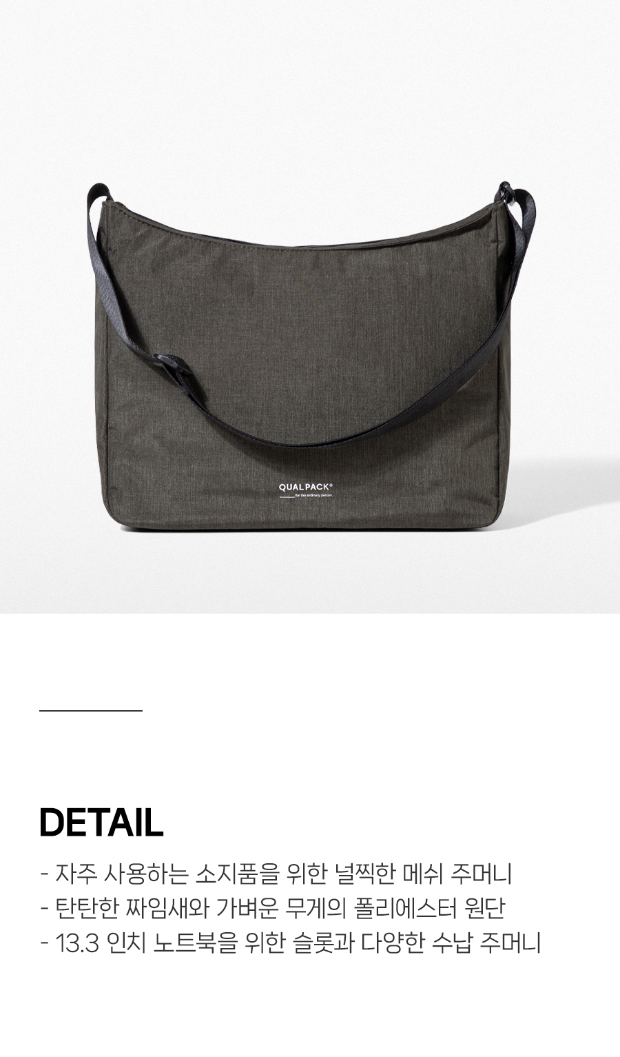퀄팩(QUALPACK)은 특별한 순간보다 평범하고 익숙한 하루에 더 가까이 다가서며, 익숙함 속의 편안함과 실용성을 담아내는 데일리 백 브랜드입니다.