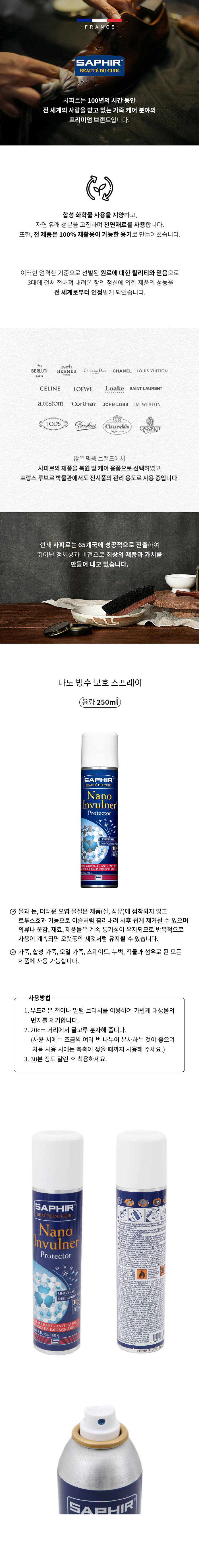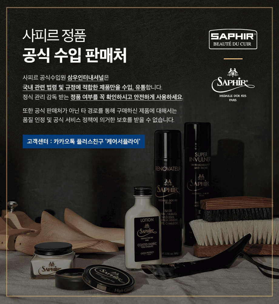 SAPHIR(사피르)는 1920년 프랑스 파리에서 설립된 프랑스를 대표하는 가죽케어 브랜드입니다. 꾸준한 연구와 최고의 재료의 결과로 가죽의 보존과 관리, 품질과 다양성으로 세계 여러나라로 수출하고 있습니다. 1925년 가죽제품의 장인정신을 오래 즐길 수 있도록 본래의 특성을 살린 케어제품 프리미엄라인을 출시하여 더욱 완벽한 제품을 선보이고 있습니다.