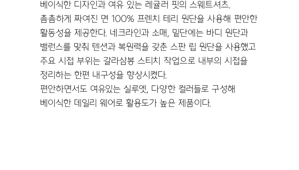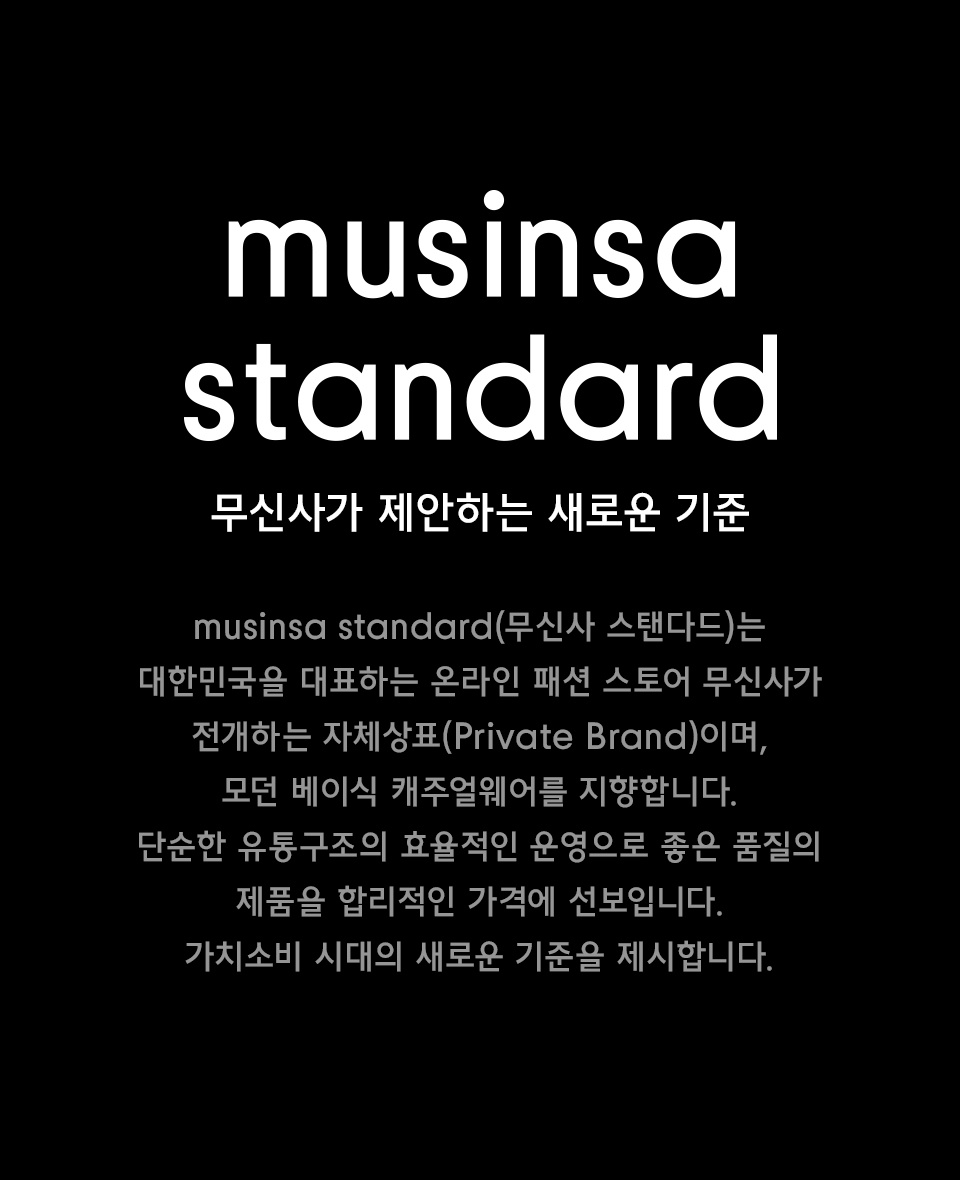 무신사 스탠다드(MUSINSA STANDARD)는 대한민국을 대표하는 온라인 패션 스토어 무신사가 전개하는 자체상표(Private Brand)이며, 모던 베이식 캐주얼웨어를 지향합니다. 단순한 유통구조의 효율적인 운영으로 좋은 품질의 제품을 합리적인 가격에 선보입니다. 가치소비 시대의 새로운 기준을 제시합니다.