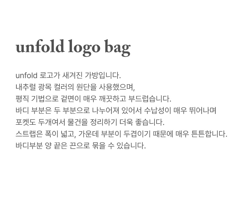 언폴드(UNFOLD)는 직접 느낀 경험에서 영감을 받아 기본에 충실한 제품을 만듭니다. 단순하지만 트렌디함과 실용성을 기반으로 언제 어디서나 자연스러움이 묻어나는 브랜드 이미지를 추구합니다.